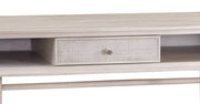 Korey Desk features a modern mix of Boho meets Coastal design. The desk features clean lines and white-washed finish on mindi veneers and box-weave drawer fronts. Brushed nickel knob add a touch of glam sophistication. Round, tapered legs are Scandinavian influence and wrap-around cane detailing. This desk features one drawer and two open compartments for storage.
