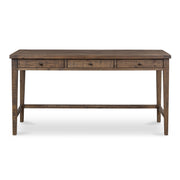 Crafted from reclaimed pine, the Liam desk tells a unique story through its aged brown finish and natural grain. The clean lines of the slight overhang top create an airy feel, while three discreet drawers offer practical storage. This farmhouse-inspired desk invites creativity, blending timeless elegance with contemporary design.