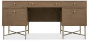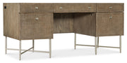 Mixing Quartered, Cathedral-Cut Oak in an earthen-toned finish with cane-front drawers and a metal base, stretchers and tapered legs, the Sonnet Executive Desk blends natural textures with a refined minimalist silhouette. The five drawers have cane-inset fronts, and there’s a removable/interchangeable writing surface and pencil tray that can be used in either the right or left top drawer. Each of the top side drawers has two removable partitions. The center drawer has a drop-front writing surface and wire management. Two locking file drawers have a Pendaflex letter/legal filing system.