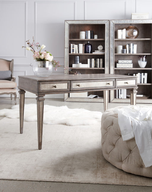 French style lovers can create a romantic work-from-home solution with this exquisite desk in a soft gray finish with gold accents, a shapely apron...