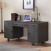 The industrial and classic design of the Actaki desk creates a spacious work area. The drawers maximize your space and your options in classic style, while keeping all your essentials neatly and safely tucked away. The gray finish and industrial style wheels, add a different look to any work space. Some Assembly Required.