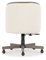 Discover the Paloma Executive Swivel Tilt Chair in the timeless, designed by Hooker Upholstery for contemporary home office spaces. Featuring a barrel back design this chair exudes a classic aesthetic. Upholstered in fabric with easy-care properties, it offers adjustable height, swivel motion, and a sturdy wood trim and base. Ideal for professionals seeking comfort and style in their home workspace setup.