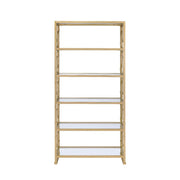 The Milavera open bookcase finished in a trendy gold, and X design on sides. Use this to keep books, picture frames, and other mementos. Features five spacious clear glass shelves for storage and display. This bookcase is perfect fit for any room in your home. Some assembly required.