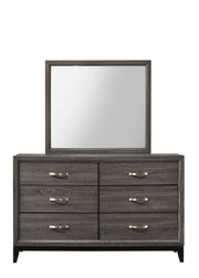 This contemporary bedroom set presents a crisp, clean look with its finish and contrasting accents. The simple, straight lines and subtle details give it a modern edge. The bed features a paneled headboard that makes a statement without overwhelming the space. The accompanying pieces, including a six-drawer dresser, a five-drawer chest, and a two-drawer nightstand, provide ample storage with a streamlined silhouette. A matching mirror adds functionality and completes the look, creating a cohesive and stylish bedroom environment. This set is perfect for those who appreciate understated style and practical design.