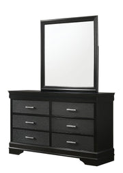 This bedroom set embodies a refined elegance with its rich black hue and luxurious textures, perfect for creating a serene and sophisticated sanctuary. The centerpiece is a sumptuous bed framed by a headboard with diamond-tufted detailing, offering a touch of opulence. The accompanying pieces, including a dresser with a gracefully matching mirror, tall chest, and nightstand, all feature a textured finish that adds depth and character to the suite.