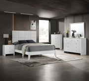This bedroom collection is the embodiment of sleek, contemporary design, characterized by its rich finish and distinctive textured front panels. The centerpiece, a chic bed with a statement headboard, features geometric paneling that adds depth and interest. Flanked by a matching nightstand and complemented by a spacious dresser with a minimalist mirror, the set offers both style and utility. The clean, linear hardware harmonizes with the set's modern aesthetic, providing a subtle metallic contrast.