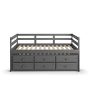 Ordered, stylish, and free of clutter. This versatile bed creates the ultimate dreamy bedroom for both children and adults. A second single bed is cleverly hidden underneath the stylishly crafted wood frame. Three fully-functional drawers at the bottom keep personal stuff within easy reach of children. Muted grey finish softens the whole bed, and perfectly complements your cozy bedding to make sure all things are relaxing and comfortable.