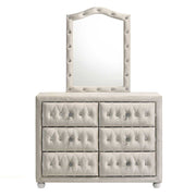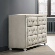 Enter the sophisticated realm of the Reggie bedroom collection. Wrapped in elegant fabric, this set features a strikingly tufted headboard and matching drawer fronts, exuding timeless luxury. The soft, padded surfaces offer both comfort and style, creating a serene atmosphere for rest and relaxation. With its blend of classic and contemporary elements, the Reggie collection transforms your bedroom into a refined retreat.