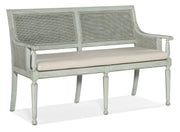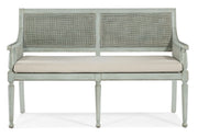 A fresh take on vintage design, the charming Charleston Bench is crafted of wood and accented by cane on the back and inside and outside arms. Featuring intricately-shaped legs, the piece is finished in Haint Blue, a soft color which can be found on the ceilings of porches and entryways, window shutters and doors in the American South, dating back more than 200 years from the Gullah folklore that held the color kept “haints” or spirits from entering homes and dwellings. The cushion is upholstered in the Oyster performance fabric for stain resistance and cleanability.
