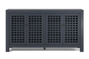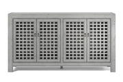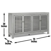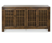 An Accent Cabinet with an heirloom feel and antique pie-safe design, the Rio 4-Door Cabinet is built for today's home accents and electronics. The 70-inch long cabinet has four adjustable shelves and lattice door fronts for semi-open display or for electronic remote use. A beautiful finish warms the room while the four adjustable shelves ensure you configure the piece exactly to your own specifications.