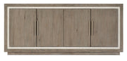 With crisp lines, a calming palette and organic texture, the Serenity Media Storage Cabinet is crafted of Oak Veneers with wire brushing. The Malibu gray washed finish is accented by a textured light gray finish in a thin border around the case, and light champagne bar pulls add a modern touch. The cabinet has 4 doors with soft close hinges with one drawer behind each pair of doors and one adjustable shelf behind each pair of doors. There’s a ventilated back panel with wire access and a power supply. Accommodates up to a 75-inch TV.