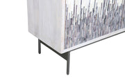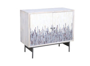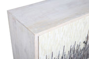 The Zooey Hall Cabinet is a modern contemporary dream, offering a bold, standout look with its unique blend of materials and finishes. The case frame is crafted from solid mango wood in a neutral white-wash finish, providing a soft, timeless base. The patterned doors are a true focal point, featuring a stunning mix of ivory and blue stained bone and resin for an intricate, artistic appeal. Custom-designed iron base and knobs finished in antiqued pewter add a touch of sophistication and refinement. Inside, the two doors open to reveal fixed shelving and convenient media cord management, ensuring both style and functionality.