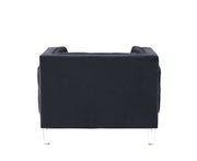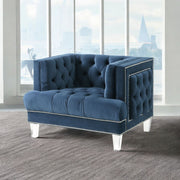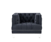 Sophistication meets modern with the Ansario living room collection. The rich blue velvet adds character to any room. Showcasing a square back, high arms, and nail-head trim, feature button tufted accents. The acrylic legs give off a modern vibe to the pieces. The full foam seats ensure that your next TV binge will be done in complete comfort.
