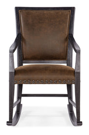 Inspired by the natural beauty of American wilderness landscapes, the Big Sky Rocking Chair is vintage, rustic and relaxing. Featuring a leather seat and back and dramatic nailhead trim, the arms, stretchers and rockers are finished in Charred Timber, a wire-brushed black evoking the restorative beauty of a fire-ravaged forest.