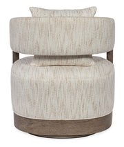 Curvy, chunky and chic, the cool contemporary Calloway Peak Swivel Chair has a fabric seat and back, accented by a loose pillow. The wood base and arm fronts are crafted of Oak Veneers in an organic soft smoked gray Mink finish. The upholstered cover is Daphne Parchment.