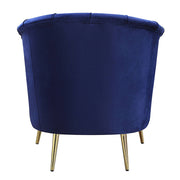 This Eivor trendsetting collection will add style and color to any room. The collection features soft feminine curves and channel tufting to create a modern home. Upholstered in a sumptuous blue velvet that is classy and bold. The metal legs and wooden inner frame make for a sturdy piece that will last for years to come. The sofa is ideal for leaning back and relaxing in style. Expand your seating area with the matching chairs.