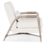 With a mid-century modern retro vibe updated for today, the Isla Lounge Chair has a tight back and loose seat cushion upholstered in the Macrame Artic fabric. The light wood finished arms and legs are accented by rope wrapping on the arms.