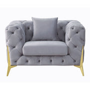 The Jelanea collection is the ideal solution to reflect your regal tastes. The classic design ensures that the pieces offer timeless appeal. The velvet upholstery brings out the glamorous side of each piece, and the metal gold legs offer a contrast to the soft velvet. Exquisite details, such as button-tufted armrests and back elevate the design. The included accent pillows further add to the comfort level of each piece. Complete your living room with these regal seating options.