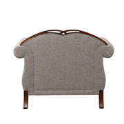 A new addition to Acme's collection of exclusive designs, the Miyeon chair in cherry finish is full of handsome details. Nailhead trim along the padded seat base runs up the scrolled arms and arched seatbacks. Button tufting on the seatback makes the fabric upholstery look especially cozy. Raised floral motifs embellish the Queen Anne legs of the piece.