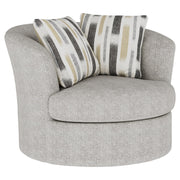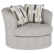 - The Myles swivel chair brings a sense of relaxed sophistication to your space. The chaise sectional, featuring contemporary tufting on both cushions and frame and sturdy solid wood legs, strikes a balance between modern design and lasting comfort. A storage cocktail ottoman keeps essentials close at hand yet out of sight. A roomy swivel chair invites you to sink in and unwind, offering a cozy spot to relax or enjoy conversation. Upholstered in light gray chenille with a faint patterned texture, this contemporary collection is designed for spaces where style meets everyday living..