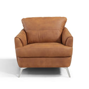 The Safi sofa is upholstered in a cappuccino finish leather and constructed with a sturdy, wooden inner frame under its dense full-foam cushioning. This mid-century inspired sofa seats up to three of your favorite people. The chrome finish featured on its metal legs, coupled with plush heavy-duty back suspension for hours of comfortable lounging.
