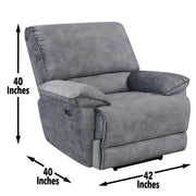 Simone offers a seat in comfort with this Power Recliner offering extra-wide seating and a plush fabric in a soft-touch grey application. The power control station on the outside arm offers a USB recharging port while the power footrest and pocket coil seating assures everyone will be comfortable for the big game.