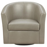 Freedom of movement adds a fresh upgrade to this swivel chair. Barrel-back design creates a comfortable seating experience and a tribute to retro fare. With leatherette upholstery, it's both inviting and easy to care for. Play up a bold print seating ensemble, or offer consistency in a classic monotone design scheme. This fashionable chair is an ideal addition to entertaining spaces.