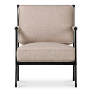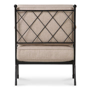 Gillian Segal for Moe's The Vecchia accent chair draws its inspiration from the revered ambiance of Italy's Posta Vecchia hotel, blending timelessness with understated elegance. Crafted with a hammered metal finish, its iron frame showcases a unique lattice detail on the back, crowned with a decorative finial, paying homage to historic Italian craftsmanship. The chair's upholstered seat, complemented by refined piping detail, speaks to comfort and an easy-to-maintain aesthetic grace.