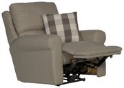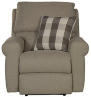 The WESTPORT power lay flat recliner features a Farmhouse Casual style with its Greek Key arm treatment, soft body fabric, and an accent pillow.