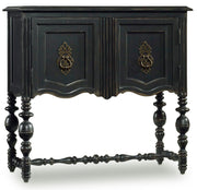 With a vintage charm, the black hand-painted leg chest with rub-though is nostalgic and timeless with turned legs and a stretcher, a shaped base and ring pulls on decorative back plates. Two doors with one adjustable shelf.