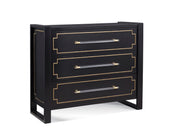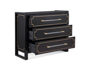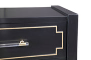 The Lowery hall chest exudes modern elegance, combining a sleek black lacquer finish with refined gold trim that outlines the drawers. The acrylic and gold bar hardware adds a touch of luxury, making this piece a striking addition to any room.