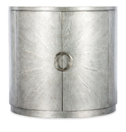 Classy, tasteful and understated, the Deserie Chest is in a timeless demilune shape, crafted of Oak Veneers with a silver leaf finish and silver-colored round twist hardware. Behind the doors is one adjustable shelf and a cream interior.
