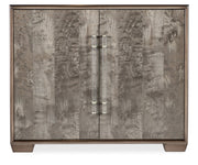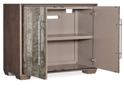 Figured Burl and Maple Veneer are dyed a shimmery soft brown and accented by acrylic and metal door pulls to create earthy elegance in the Dorian Accent Chest. The two doors open with magnetic catches and reveal one adjustable shelf behind, and a smoothly- painted interior. Measures 41 inches wide by 19 inches deep.