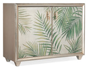 Strike an easy breezy tone with the Let’s Be Friends Two Door Chest, featuring a gold leaf finish and a tropical design on two handpainted glass front doors. Crafted of wood and glass, there’s one adjustable shelf behind the set of doors and a ventilated back panel. Custom palm-shaped gold hardware adds a final accent.