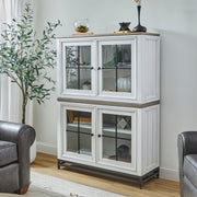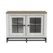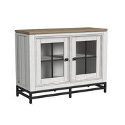 - Subtly distressed white finish with a gray parquet stained top
