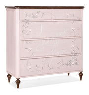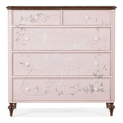 Beautiful and uplifting, the Moment of Hope Chest has a serene pink finish with handpainted lettering and delicate floral accents on the drawer fronts. The five self-closing drawers have creamy white interiors, and a contrasting wood finish is featured on the top and legs. Crafted of Oak and Walnut Veneers, the chest is part of a curated collection to honor the spirit and courage of those battling breast cancer, with a portion of the proceeds from each chest sold going to the Susan G. Komen Foundation.