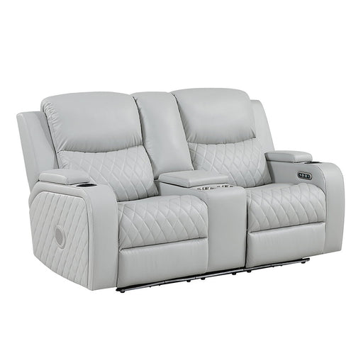 Elonzo - Power Motion Loveseat With Console, LED, Power Headrest & Speaker - Light GrayProduct Features Seat Construction: Pocket Coil Wooden I...