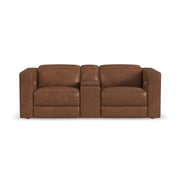 Casually elegant and substantial in form, the Austin power reclining loveseat with power headrests and console defies expectations with customizable comfort and Zero Gravity technology. Wide track arms, spacious seat cushions, and integrated storage beckon relaxation, while alluring in-back channeling and a bold geometric profile add contemporary flair. Upholstered in sumptuous leather that develops a patina as it ages, the Austin loveseat is designed for those who appreciate the authentic character of materials.