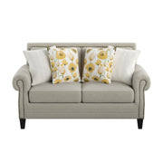 - The Celia loveseat livens up any room with the burst of color from the printed poppy pattern storage ottoman and accent pillows that contrasts well with the bronze nailhead trim, elegant rolled arms, and tapered solid wood legs.