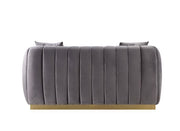 The Elchanon collection is as chic and glamourous as it is comfortable. Plush vertical tufting creates a streamlined effect adding tailored vintage glamour into the pieces. The gold metal base adds visual interest to the subtle gray finish. Create a cozy longing seating area with the wide seating and lush velvet upholstery. The dense foam seating provides hours of comfort and support.
