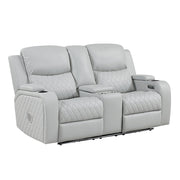 Elonzo - Power Motion Loveseat With Console, LED, Power Headrest & Speaker - Light Gray