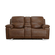 Introduce a sophisticated touch to your living room with the Fenwick power reclining loveseat with power headrests. This elegant piece showcases unique, banded cross-stitching details that add a refined texture and visual appeal to its premium, cognac brown leather upholstery. The plush, divided back cushions and fully padded footrests offer supreme comfort, perfect for relaxing after a long day. With independently adjustable recline and headrest support, you can effortlessly find your ideal position at the touch of a button. Plus, the center console provides a place for drinks and storing remotes, magazines, and more. Flexsteel’s patented Blue Steel Spring™ technology offers unparalleled durability and support, making this loveseat a lasting addition to your home.