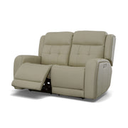 Enjoy the beauty of well-designed lounge furniture and the comfort and convenience of a recliner with the Grant leather power reclining loveseat with console. Plush back cushions, contoured seats and footrests with ample padding provide support, while a convenient center console offers storage for remotes, beverages and more. This sofa is built with Flexsteel's patented Blue Steel Spring™ system, offering a mix of flexibility and durability. Easy-to-access power controls on both sides of the recliner allow sitters to independently adjust the recline and headrests, while a built-in USB port allows you to conveniently charge devices. Premium ivory white leather enhances the elegant look of the loveseat, which includes beautiful tufting on the back cushions and distinctive sloped arms with refined cross-stitching.