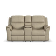 Treat yourself to a comfortable yet refined sitting experience with the Henry leather power reclining loveseat with console and power headrests and lumbar. This generously scaled frame is upholstered in a beige leather, and features contoured seats and padded arms with a unique sculptural shape and welt trim. The center console contains a storage compartment, wireless charging tray and pop-out dual cupholders. Power recline, headrest and lumbar control on both sides allows for customized comfort, and included USB ports provide convenient device charging. The Zero Gravity recline technology gives the feeling of weightlessness while Flexsteel's patented Blue Steel Spring provides lasting seat support.