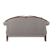 A new addition to Acme's collection of exclusive designs, the Miyeon loveseat in cherry finish is full of handsome details. Nailhead trim along the padded seat base runs up the scrolled arms and arched seatbacks. Button tufting on the seatback makes the fabric upholstery look especially cozy. Raised floral motifs embellish the Queen Anne legs of the piece.