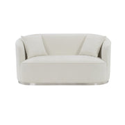 Unwind and rest when seated on this luxurious beige chenille Odette loveseat. This lovely loveseat is just the thing to inject drama into your living space. The plush seating offers countless hours of relaxation. The unique barrel shape immediately commands attention, and the brushed chrome stainless steel detailing finishes off the base in contemporary panache.