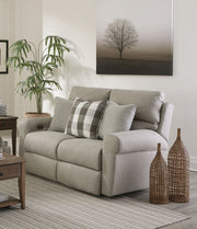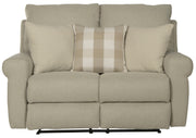 The WESTPORT power lay flat reclining loveseat features a Farmhouse Casual style with its Greek Key arm treatment, soft body fabric, and included accent pillows.