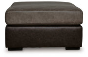 Living room lounging gets a dose of approachable luxury. This sleek oversized accent ottoman is defined by supple faux leather in contrasting rich brown hues, creating a stylish monochromatic look with dimension. From morning coffee to late-night movie marathons, it's sure to elevate the everyday.