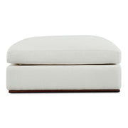 The Rue ottoman features a generous 70% feather-fill topper within its seat. Its elegant silhouette is highlighted by a rubber wood base, creating a sleek floating appearance, all supported by subtle wooden legs. Designed with extreme comfort in mind, this ottoman embodies easy, neutral styling.