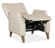 A harmonious blend of curvaceous lines, the Rumero press-back upholstered leather recliner has shaped arms and a modern bustle-style back. Curved wood legs in a light finish add to the sense of energy in the silhouette. The semi-aniline top-grain leather cover is called Apollo Mineral.